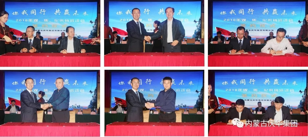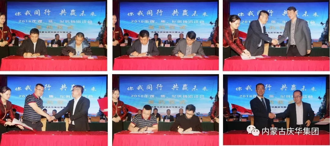 會議在熱情融洽的氣氛中進行,參會各企業代表踴躍發言,獻計獻策, 共商合作大局,并取得豐碩成果。內蒙慶華集團與參會企業代表簽訂各類合同30余份,共計其中焦炭銷售約230萬噸,精煤采購約300萬噸,運輸協議簽訂量約270萬噸,化工產品的采購銷售量約110萬噸。